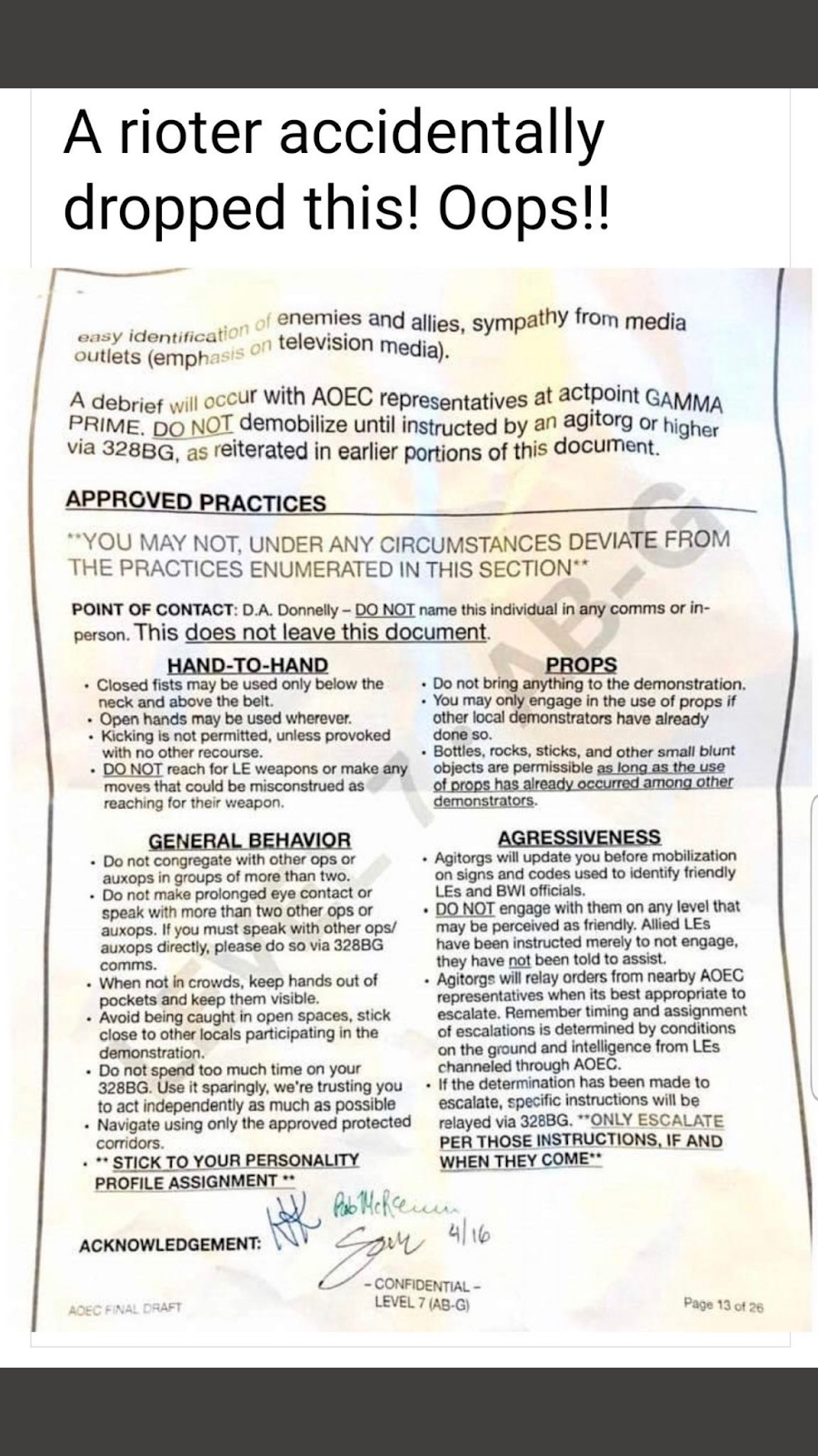 Note that every page has to be initialed by recipients, and strict discipline is imposed on them. I ran that image past my law enforcement contacts in a few states and cities. Several replied that they'd seen the same sort of thing in their areas. One pointed out that the handout shown above was 26 pages long, and that enough other pages had been found in various places (mislaid, or on the person of arrested organizers) to reconstruct almost the whole document. The radio frequencies and encryption used by the riot coordinators are also known by now, and interceptions are happening in real time. There's a massive effort underway to coordinate intelligence and information, in the hope that this will lead to a crackdown on those responsible. It can't happen too soon for me!